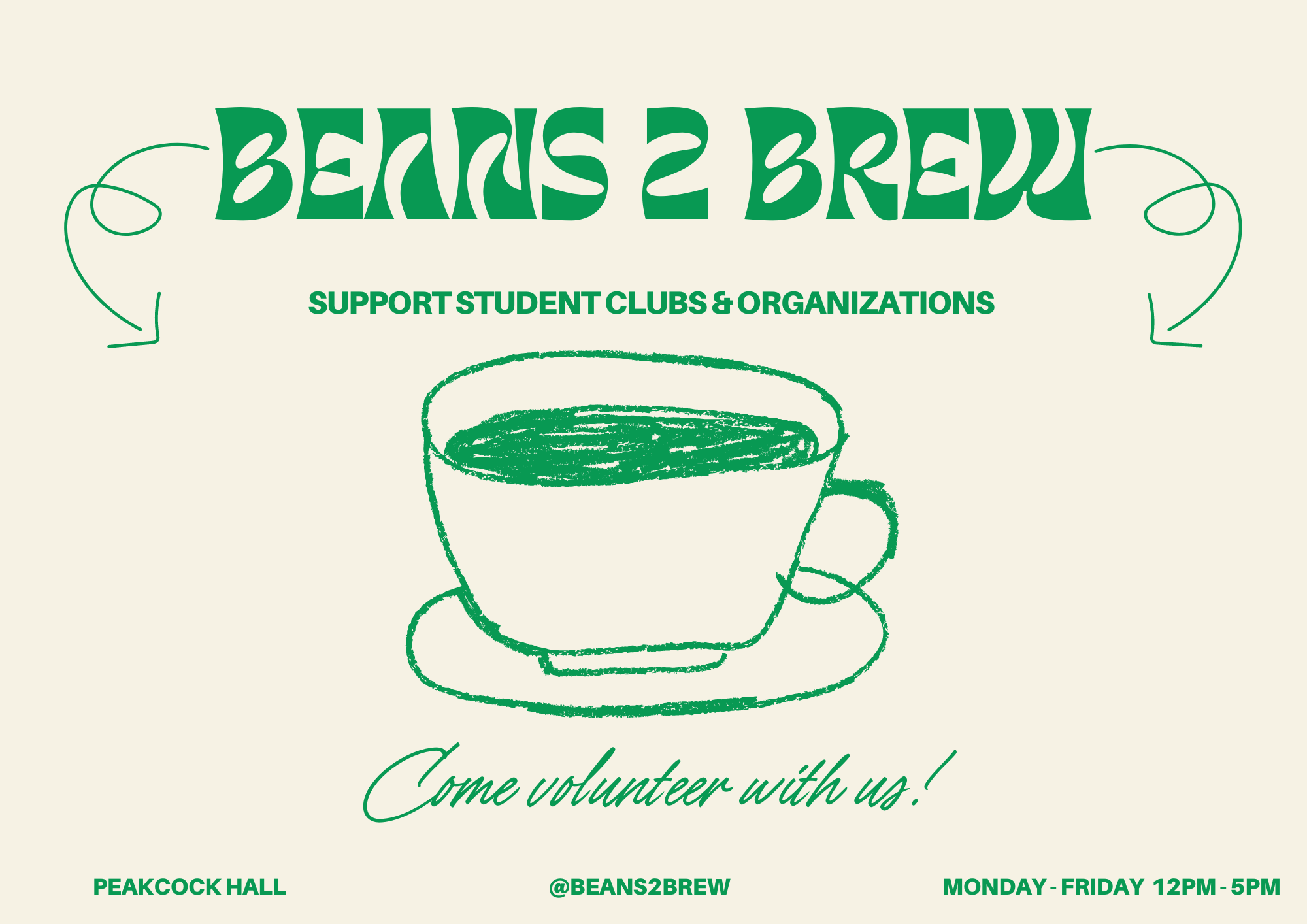 My primary role was to write and edit copy for my colleagues’ designs and social media posts. It was my job to ensure that the messaging was clear, consistent, and aligned with Beans2Brew's branding. I was also tasked with designing posters to promote Beans2Brew and their volunteer opportunities.