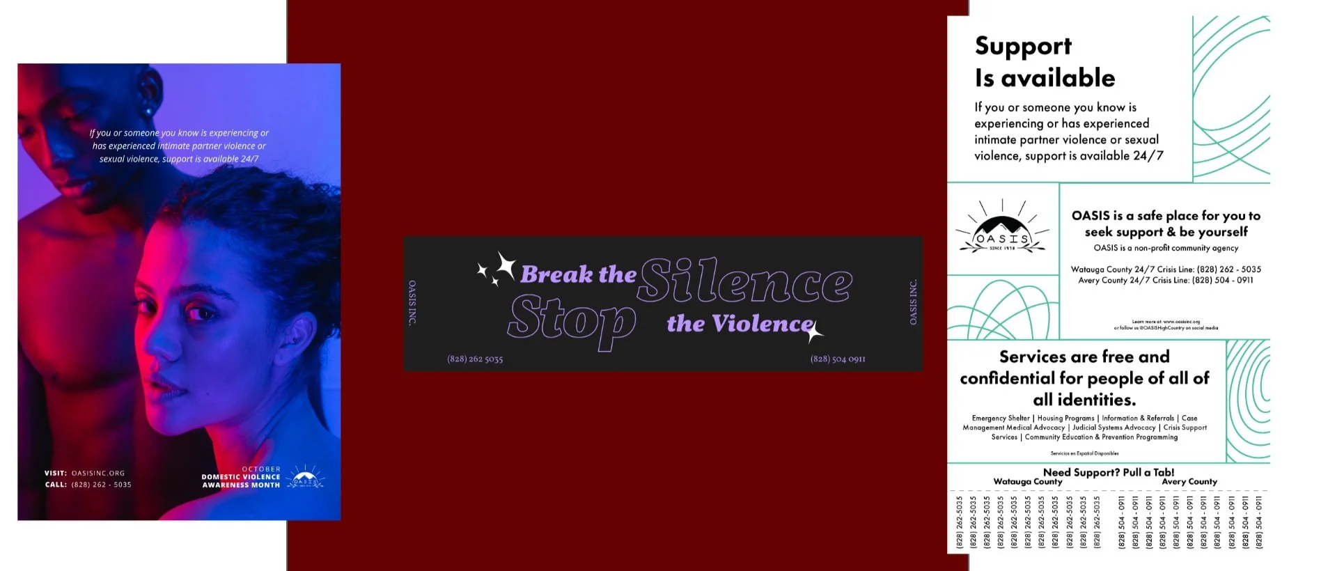 My responsibilities included designing posters to raise awareness about Oasis's services, as well as writing copy for my colleagues pull tab poster, bumper sticker, and social media posts. My focus was ensuring each design had consistent messaging that was empathetic and aligned with Oasis's mission.
